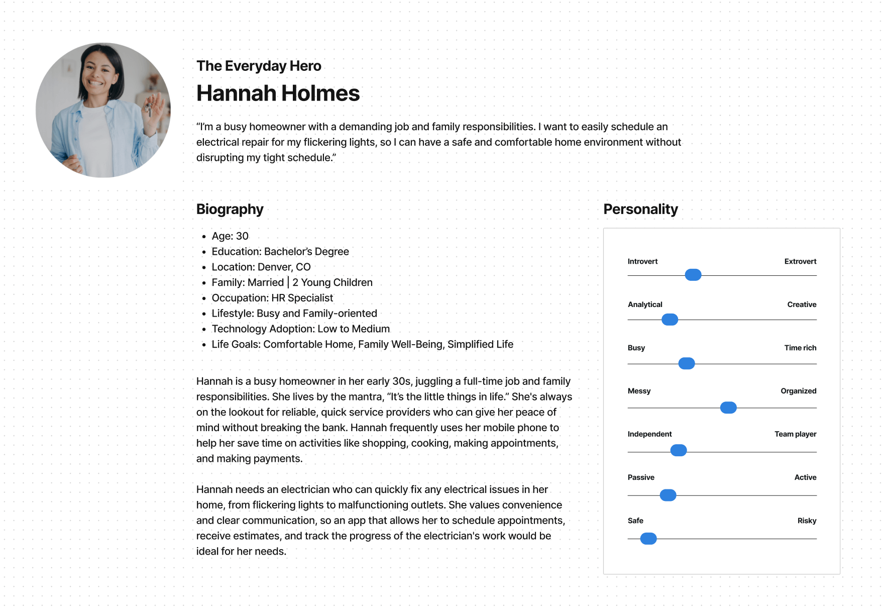 Hannah Holmes is a busy homeowner with a demanding job and family responsibilities. She needs to easily schedule an electrical repair for her flickering lights, because she wants to have a safe and comfortable home environment without disrupting her tight schedule.